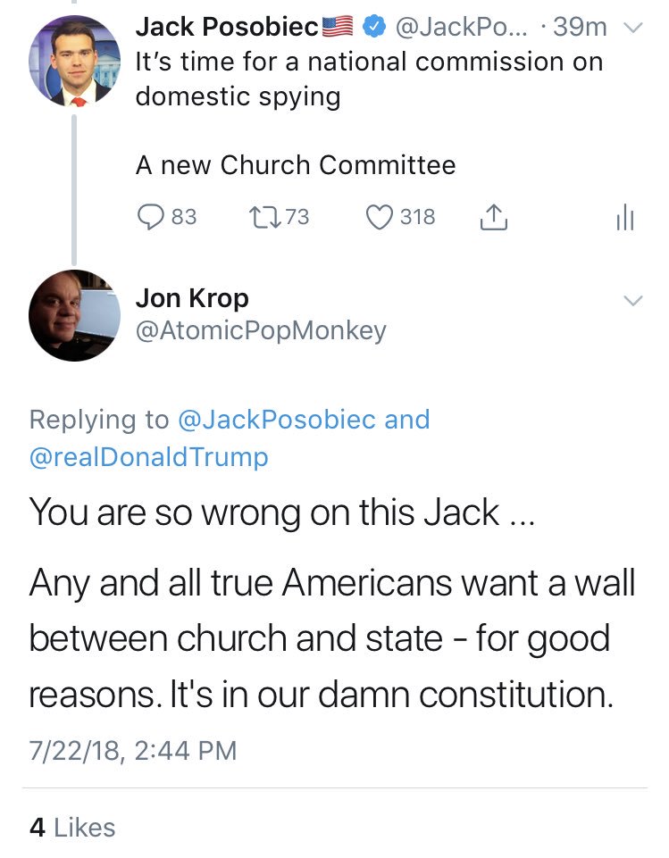 I once got the "separation of church and state is in the Constitution" line from the head of the Political Science department at my university