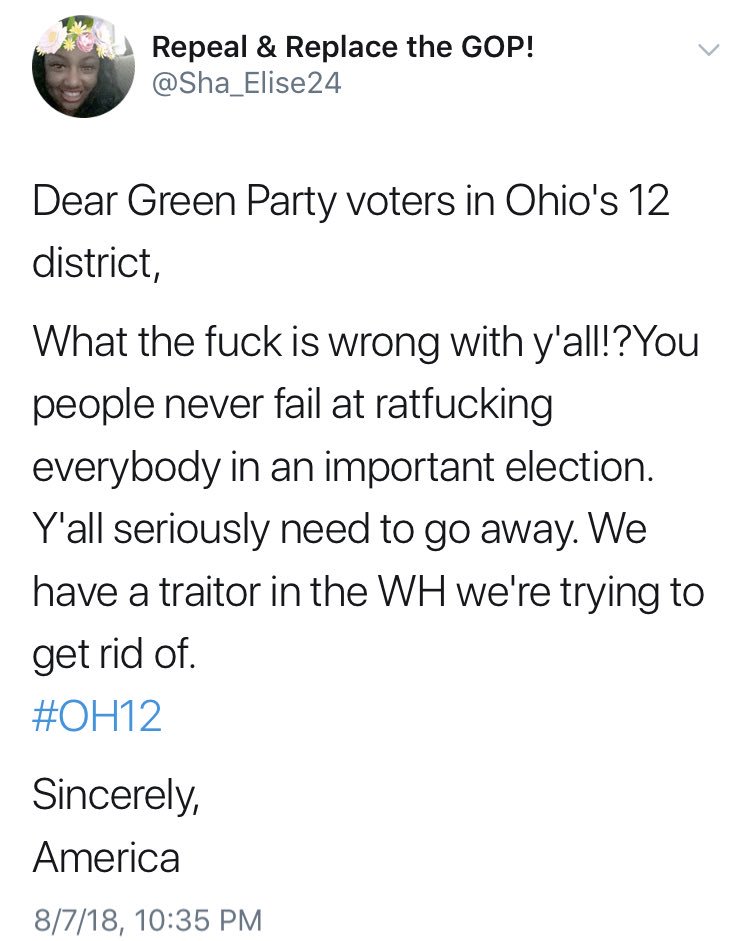 No doubt these brilliant well reasoned persuasive tweets will cause Green Party voters to be persuaded to vote Democrat.