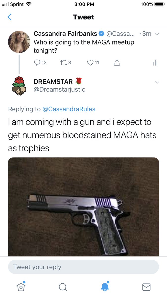 An anonymous Twitter user with an account dedicated to promoting the Democratic Socialists has threatened a mass shooting at Tuesday evening’s MAGA Meetup at Trump Hotel in DC.https://www.thegatewaypundit.com/2018/09/democratic-socialist-threatens-mass-shooting-at-trump-hotel/ …