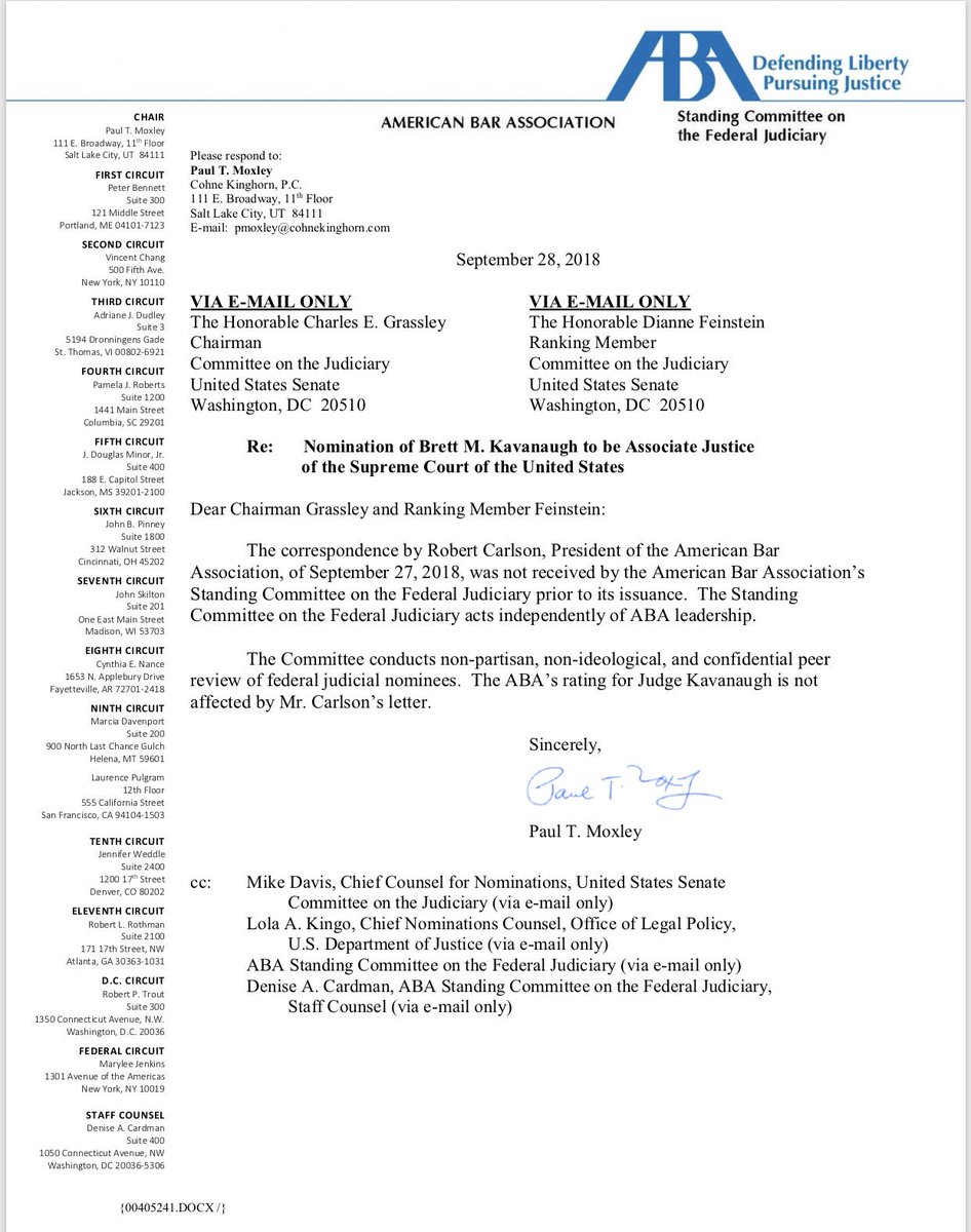 NEWS: @ABAesq Standing Committee on the Federal Judiciary writes to note that the their “well qualified” rating of Judge Kavanaugh has not changed, and the call for a delay “was not received by the ABA’s Standing Committee on the Federal Judiciary prior to it’s issuance.” pic.twitter.com/RnqkqcRQAW