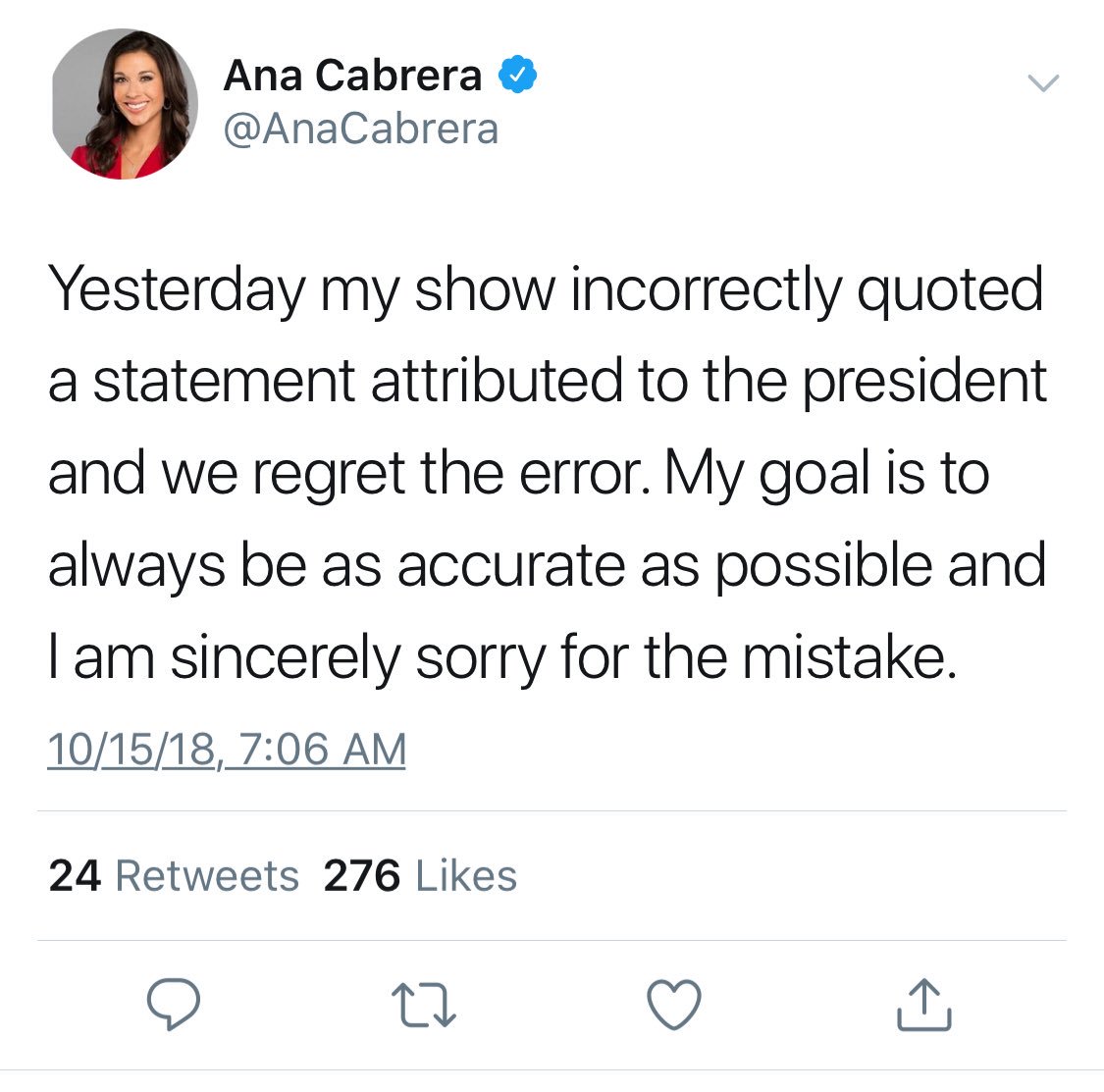 Correction tweet only has 24 RT’s, how many saw your @CNN segment @AnaCabrera , and still believe the story? This happens every day, most false stories like this one are never corrected.pic.twitter.com/N0cu6GBIJL
