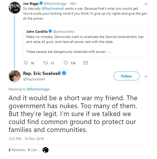 @RepSwalwell is threatening US Citizens with nuclear weapons. Sounds like someone needs straightened out with his life threatened and maybe even acted upon like Antifa attacks those who they disagree with.Thanks. Twitter will use this to make your timeline better. UndoUndo