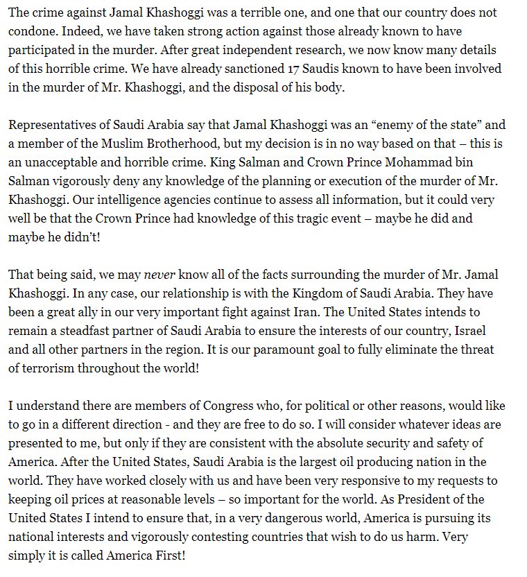 I honestly don’t care about Khashoggi, he was a Muslim Brotherhood plant. Turkey & Iran have killed & jailed numerous journalists & citizens for years, and the MSM, Uniparty, UN, Deep State has completely ignored it. Trump is right here.