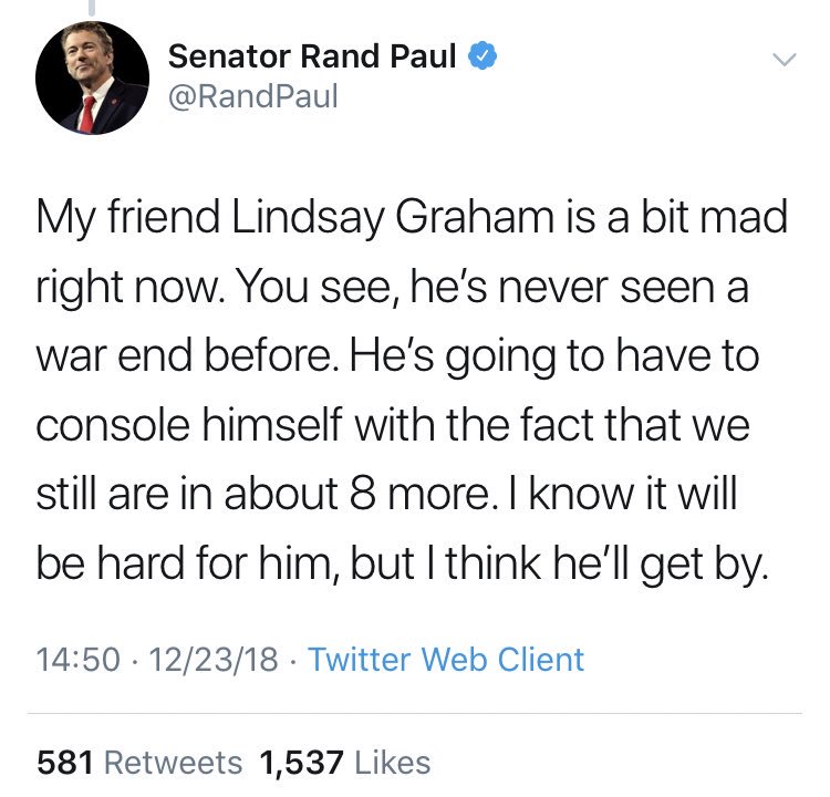 I am 100% with Rand Paul. I have never understood how traditional Democrats and Traditional Republicans LOVE Wars and LOVE staying in wars that never end. Our country should be praising Trump for pulling out of war! Wars r stupid
