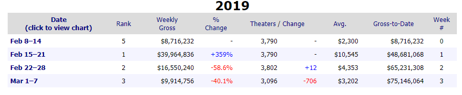 #AlitaBattleAngel was dropped from over 700 theaters, it only lost $1k in average - meaning that per screening had more viewers per screen than the previous week#AlitaChallengepic.twitter.com/p0RK4A81ZN