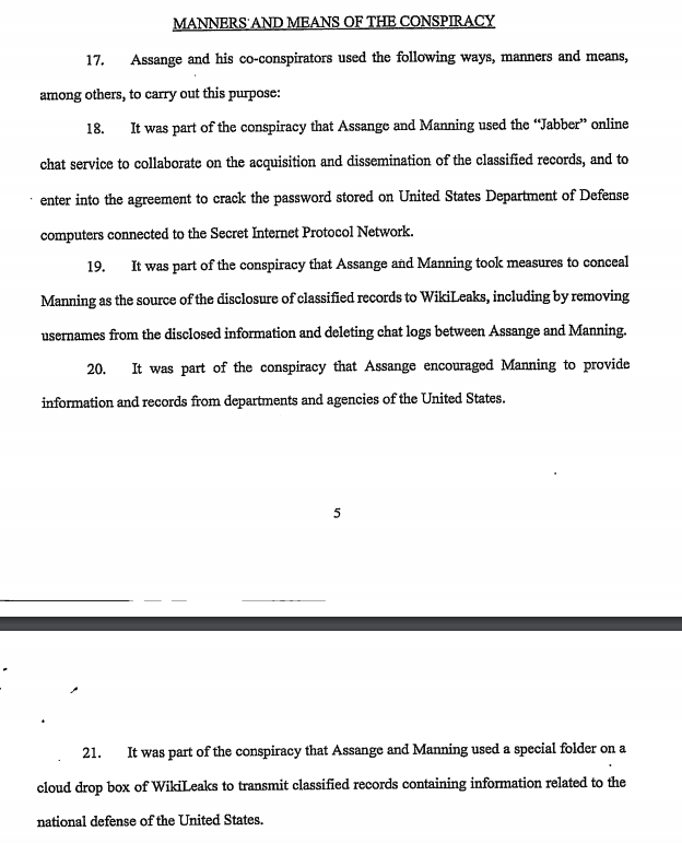 This is more of an indictment of Manning than of Assange, but conspiracy to hack a gov computer is quite illegal.
