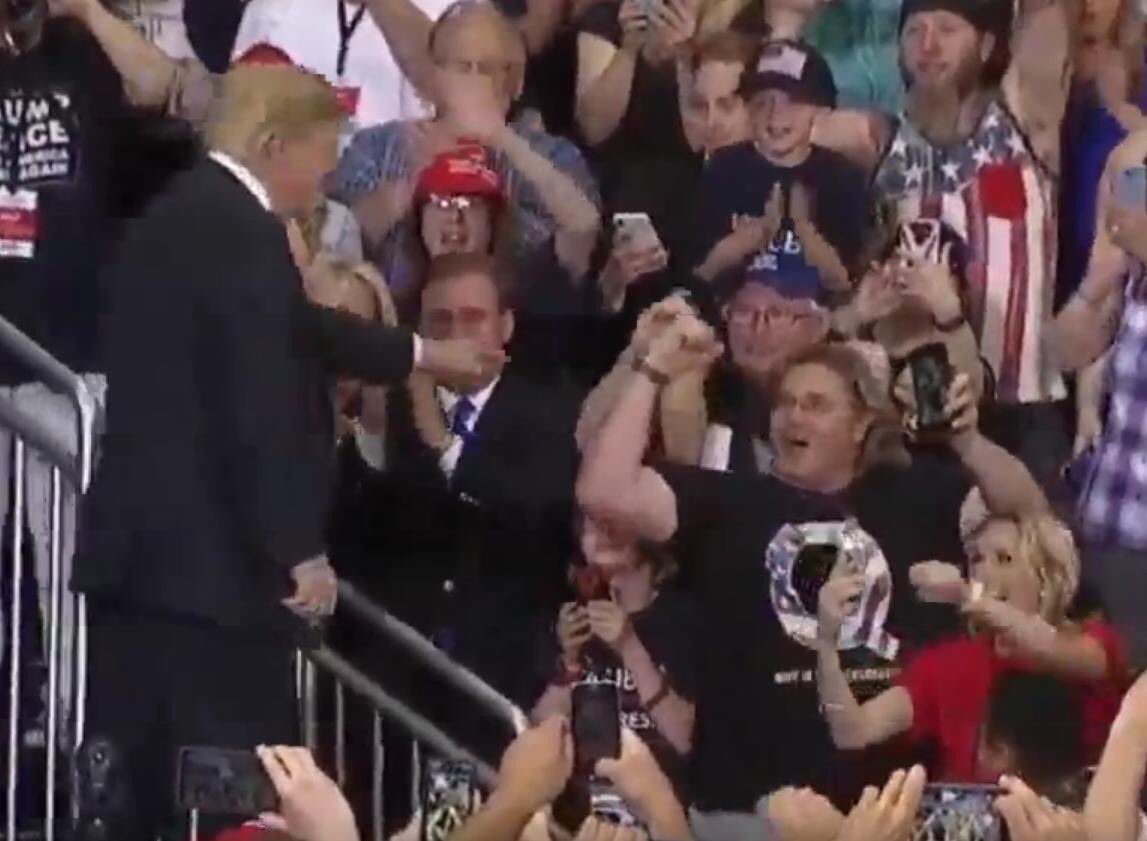 It looks like he’s pointing to the guy behind the Q T-shirt. But love the Q T-shirt in the photo!