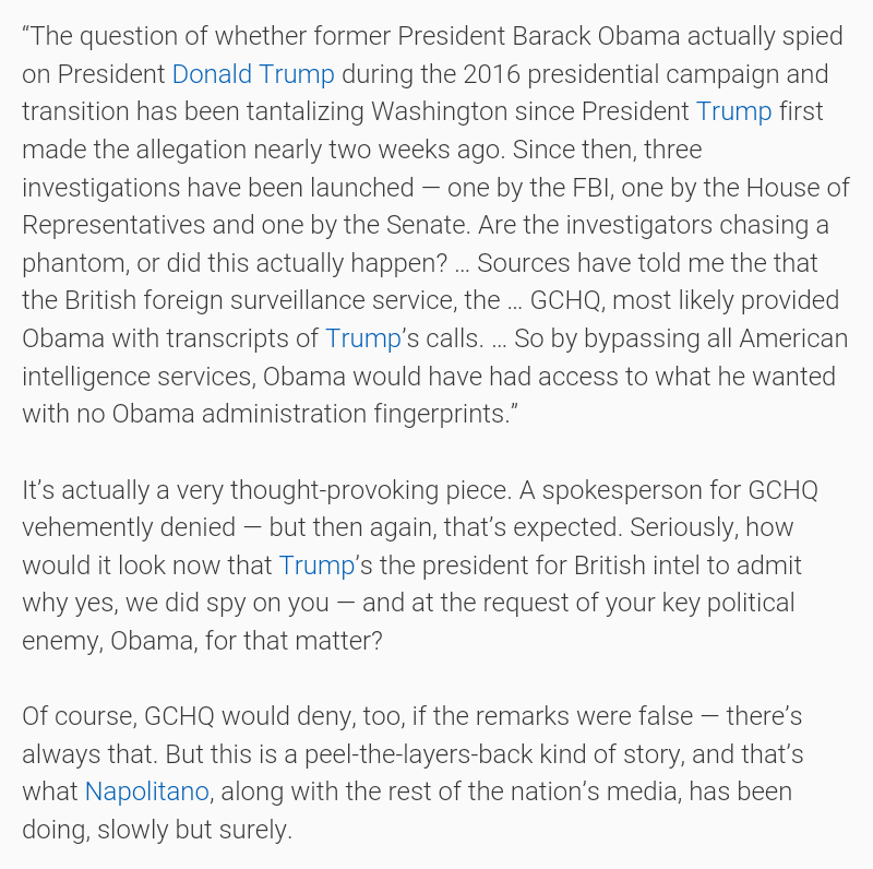 The idea of British intelligence spying on Trump for Obama got Judge Napolitano suspended on Fox News... https://www.washingtontimes.com/news/2017/mar/21/andrew-napolitano-suspended-fox-wiretap-claims-fiz/ …pic.twitter.com/ZWn7IpctVO