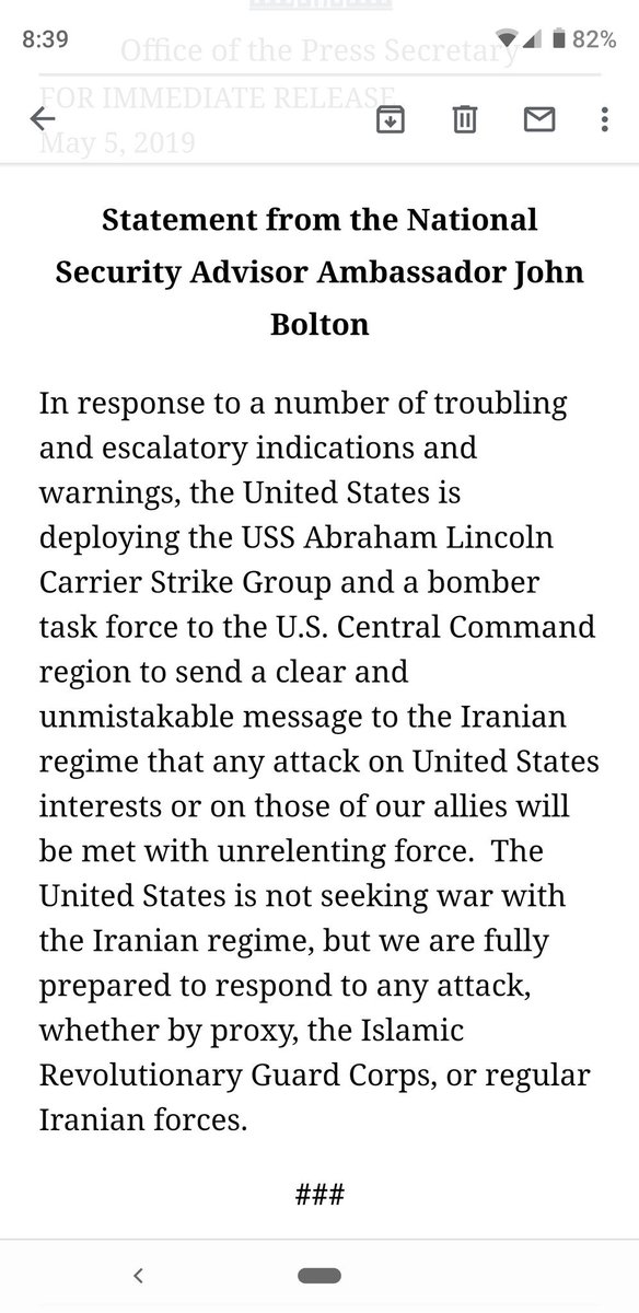 INBOX: John Bolton says US sending carrier strike group and bombers in warning to Iran: "Send a clear and unmistakable message to the Iranian regime that any attack on United States interests or on those of our allies will be met with unrelenting force." pic.twitter.com/hSG9aeXGoq