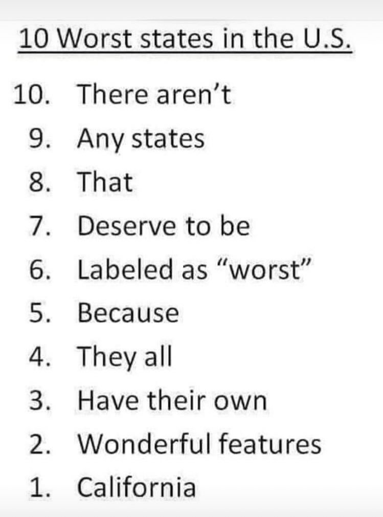 I’ve lived in California all my life and the only places that are bad are San Francisco and LA.