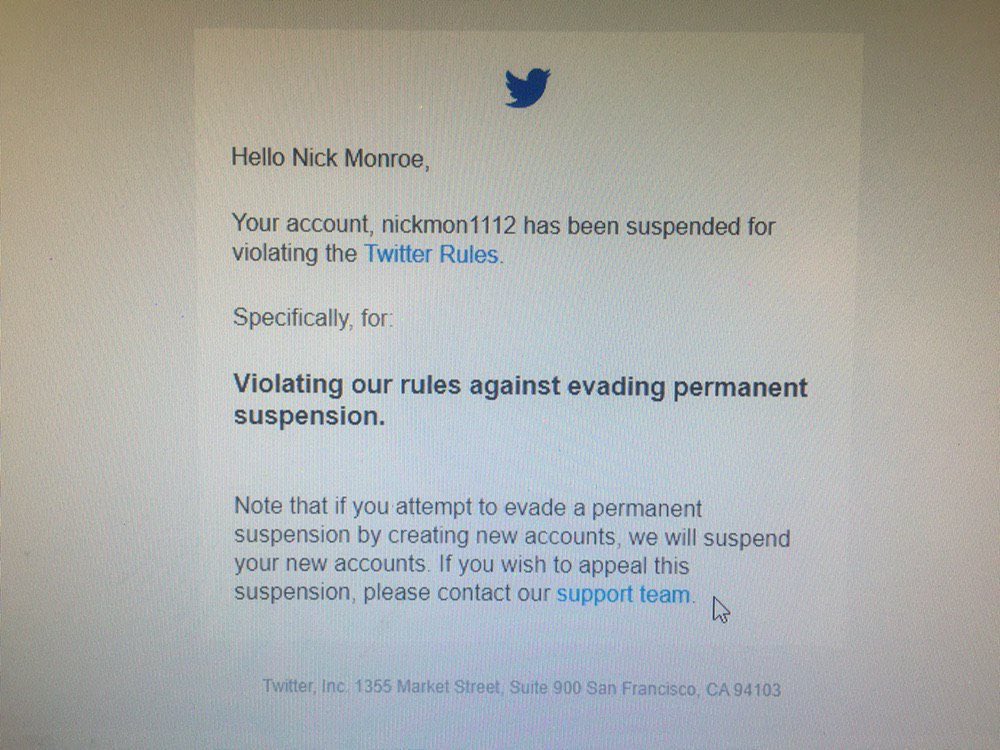 He's only had temporary suspensions before - which were also bullshit. As far as I know this is and was his only account. He can be found on https://gab.com/nickmon1112 where here's archived a lot of this threads already, and he just posted a link to his new