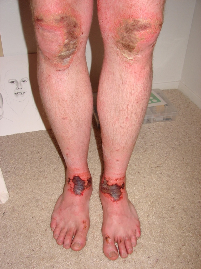 Personal Protective Equipment for dry cement is a breathing mask, and chemical goggles, plus rubber clothes. This is what happens if you don't wear rubber clothes. I have had similar injuries. The burns are worse where the cement rubs the skin, at the joints.pic.twitter.com/pi2X4vpFrm