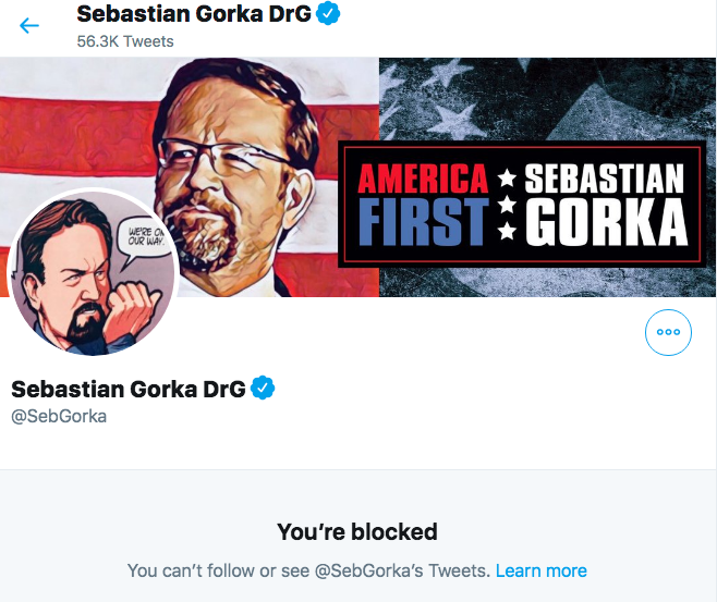 @Sebgorka follower/supporter for months.... but I noticed I wasnt seeing his tweets this week. It appears I have been blocked! Not sure why he would bother blocking me? I never comment on his tweets. Could this be Twitter playing games to stop his reach?pic.twitter.com/To1LfhAbZ9