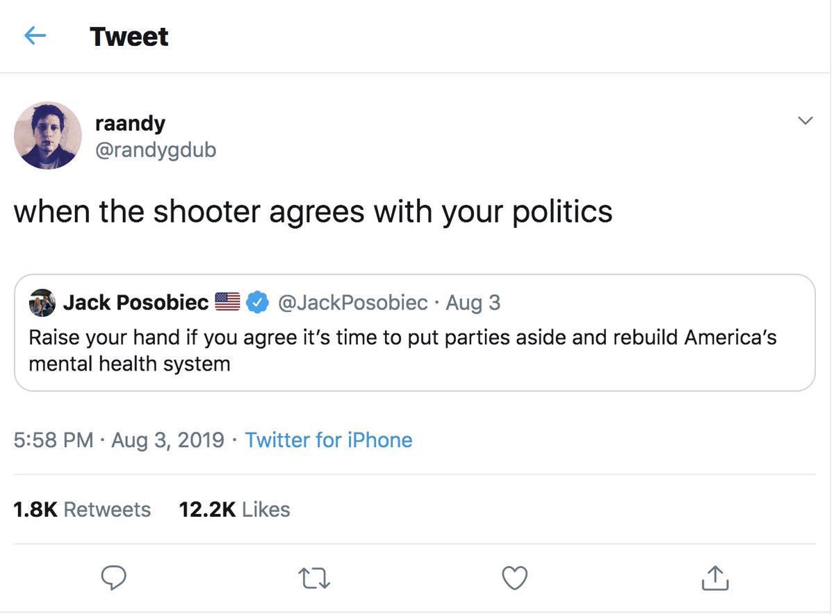 Jack are you upset that the El Paso shooter agreed with your politics and did the shooting because of your politics, but the Dayton shooter agreed with Raandy's politics and did the shooting because of other reasons?