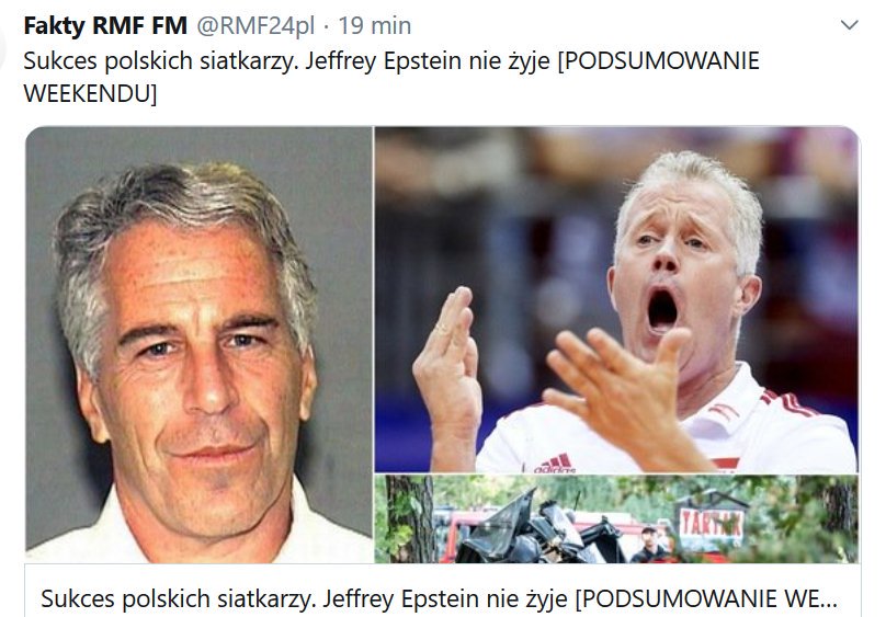 Fun fact: this is a headline from Polish website, it says: Great success of volleyball national team. Jeffrey Epstein is dead [WEEKEND SUMMARY]pic.twitter.com/N8HVCyieg0