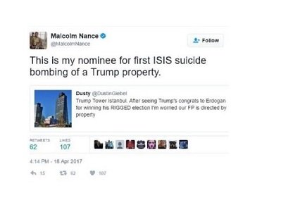 This is the SAME Malcolm Nance who called for #ISIS #terror attacks on #Trump properties - in writing. You can only imagine what is not done in writing. And Mr. Nance believes that this makes him a "#counterterror" expert.pic.twitter.com/G4EWImIzVJ