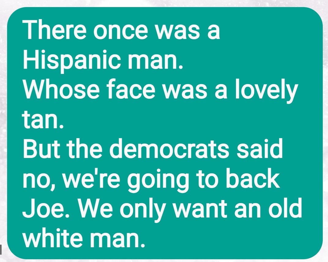 My 9 month old twins simultaneously queried us, in Shakespearean pentameter, if Julian Castro's dropping out of the race means that our society is hopelessly racist and white supremacist... Alas, we were at a loss for words, couldn't answer, and sat silently in the dark...