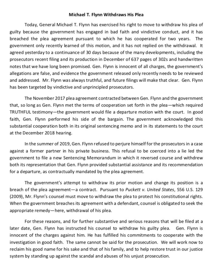 Flynn's lawyers claim DOJ breached the plea deal when it rescinded request for credit for his help to investigators - HOWEVER - the agreement says that request is sole discretion of the govt.pic.twitter.com/d2QJaTymI4