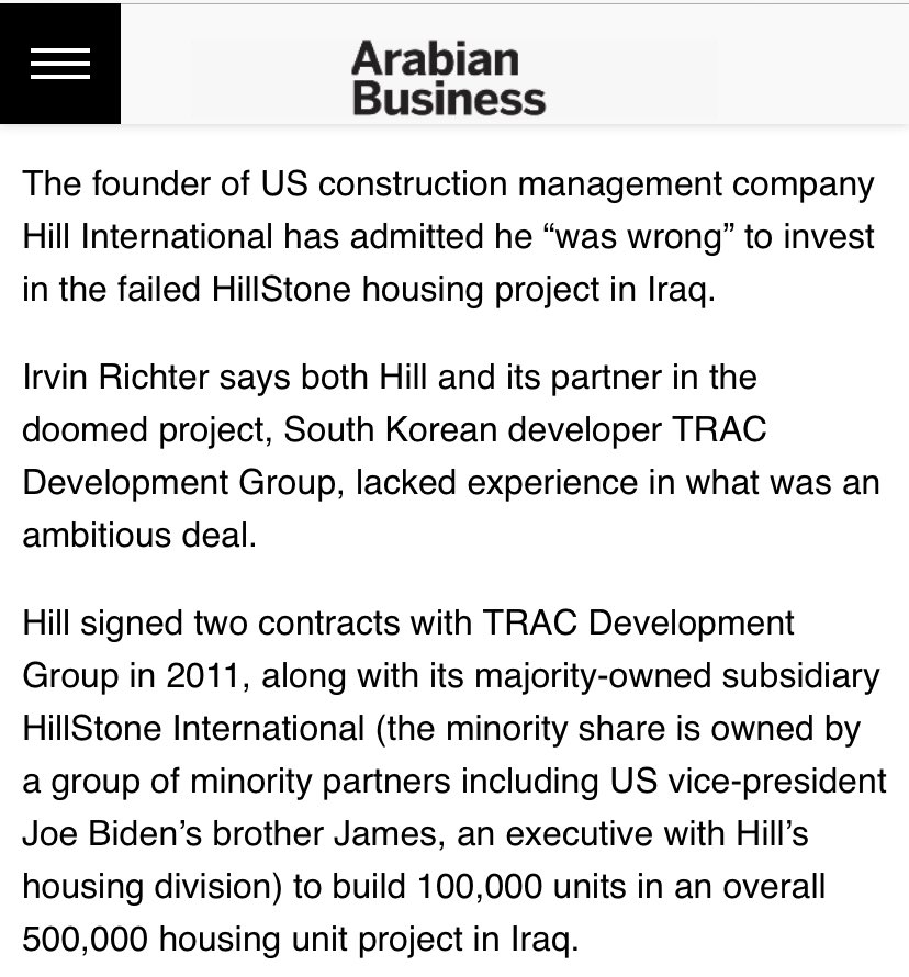 11/23/2010 - Hill INTL announces James Biden has joined its subsidiary, Hillstone INTL as Exec VP 06/02/2011 - 6 months after Biden has joined Hillstone INTL, Hillstone awarded 1.5 billion contract. Feb 2014 - Hill INTL “admits mistake” in “failed housing project in Iraq”.pic.twitter.com/UepqNR1Ndh