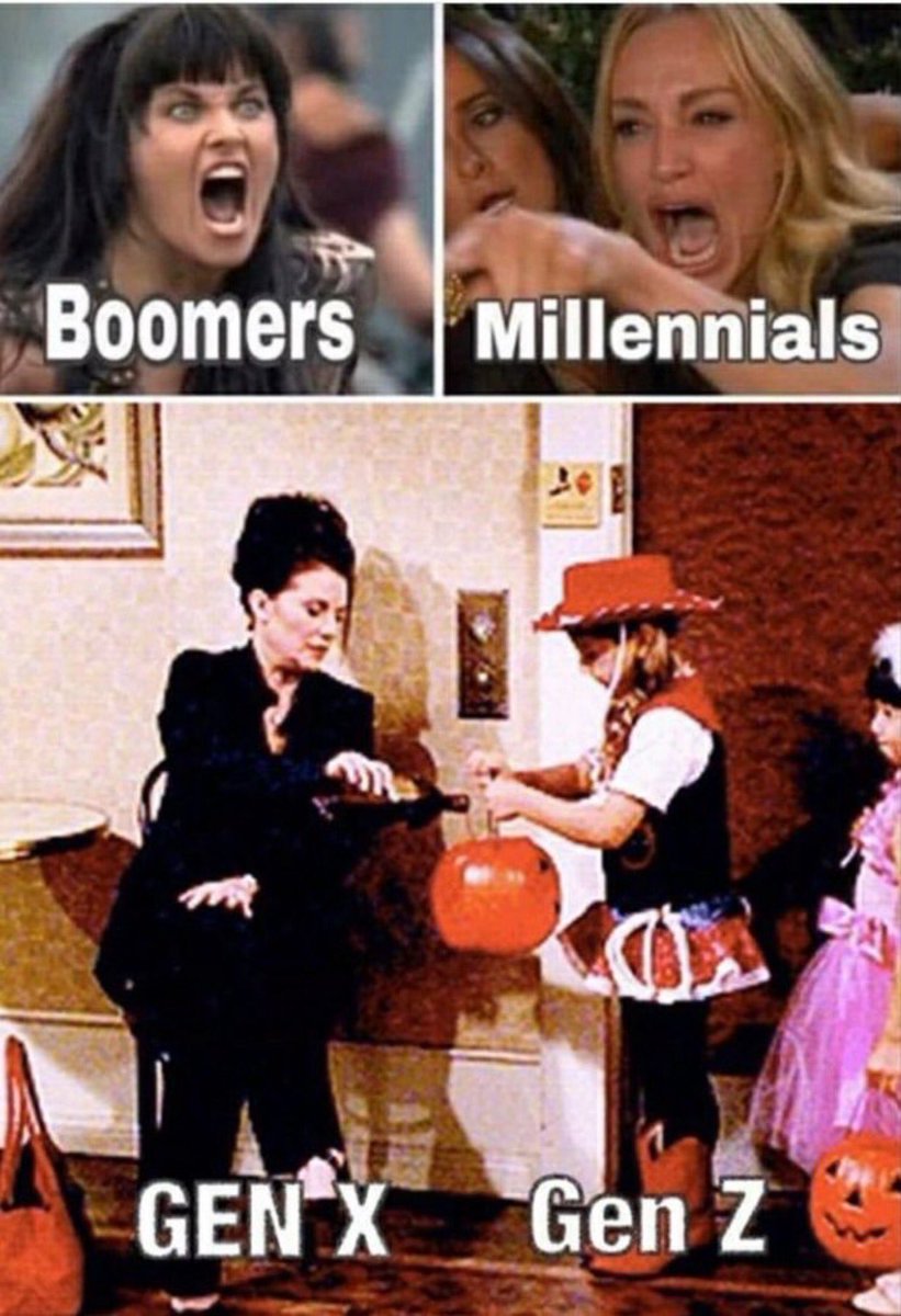 Boomers: We're so independent that we want a big government. We will shit on future generations and be selfish. Gen X: We counter with Technological breakthroughs and Nirvana. Millennial: Boomers should pay for my life. Centennial (Gen Z): I am so glad I was raised by Gen X