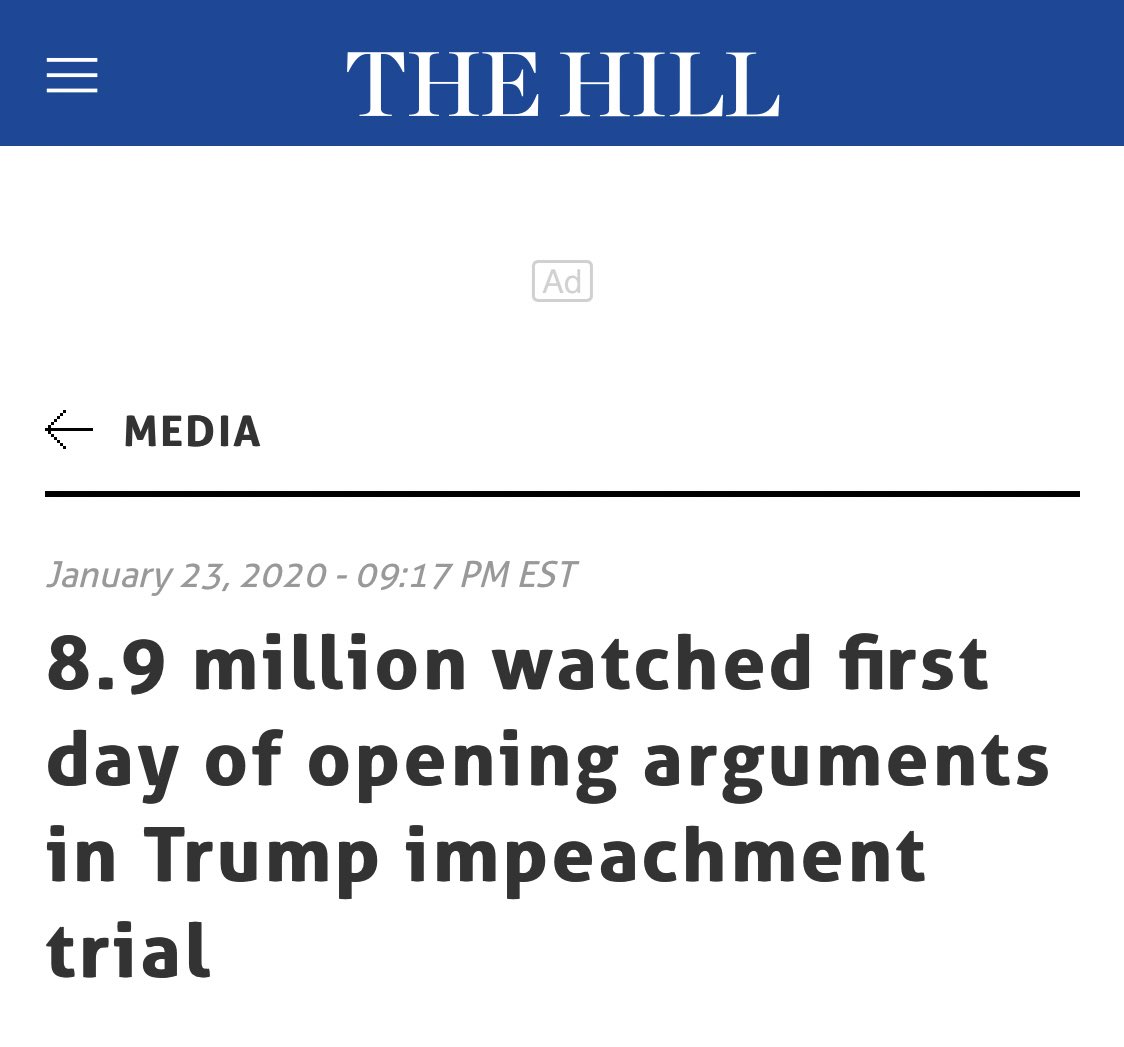 13 million people watched Mueller hearing, and that low number was considered a ratings fail. Just under 9 million watched the Senate impeachment hearing. (Over 20 million watched Kavanaugh.) pic.twitter.com/BEbd79rchM