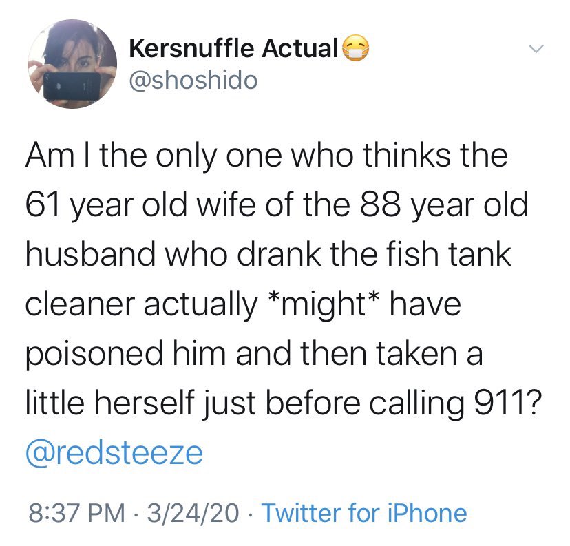 What I want to know is how much fish tank cleaner was in her system compared to her husband, this is pivotal in determining is she knowingly ingested just enough of the substance to to not arouse too much suspicion when she collected her husbands life insurance & blamed Trump