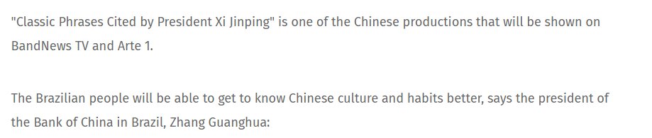 They don't even try to hide it anymore. Here in Brazil a public channel started airing a chinese program called "Classic Phrases Cited by president Xi jinping" Don't believe me? https://radiobandeirantes.band.uol.com.br/noticias/5dc99d7f283f811860079513/bandeirantes-assina-acordo-de-cooperacao-com-china-media-group-para-producoes-conjuntas …pic.twitter.com/CzKoKfQy9J