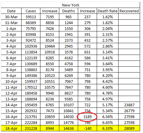Those numbers for nyc were adjusted overnight, because the way the city was recording deaths, did not fit our Socialist Mayor and Gov mission to keep everyone locked-in.