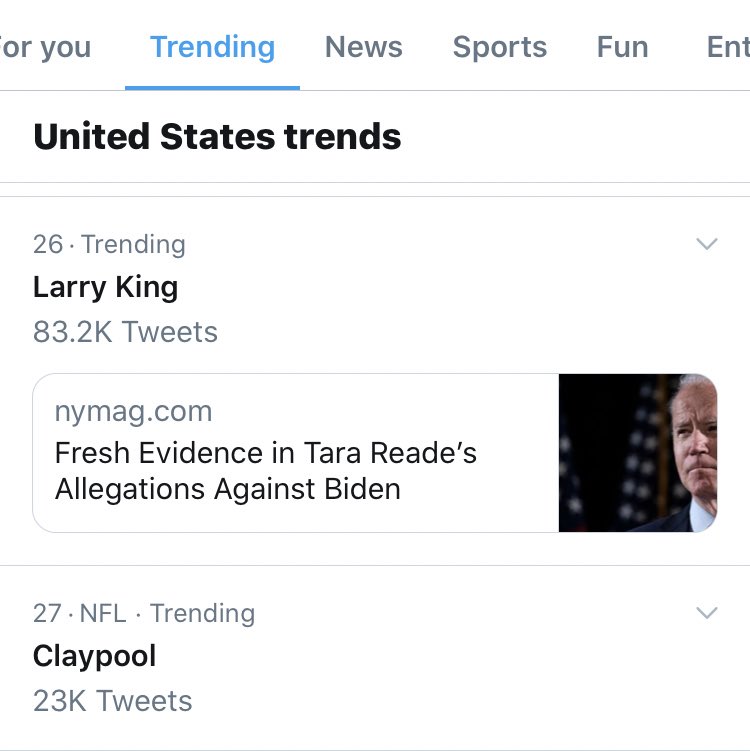 If the accusations on Biden was more accurate than it would be a top trend topic. If this was a real problem she would've reported Biden back in '93 but when Biden is the candidate for Prez now it comes out 2 decades later? The timing is suspect and feels politically motivated.