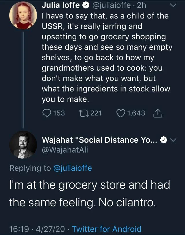 I was at a Walmart the other day and had to stand in line for toilet paper and paper towels; they were handing out 1 per customer off the pallets. Then I hear the lady in line behind me go: “can I get toilet paper AND paper towels?”. Now THAT was jarring!