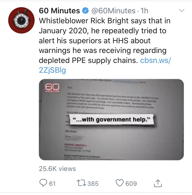 If their “bombshell whistleblower” was a genuine material witness to govt wrongdoing he wouldn’t be giving an interview to 60 minutes. LOL More media/Democrat political smear campaign collusion. Y A W N —Rick Bright.