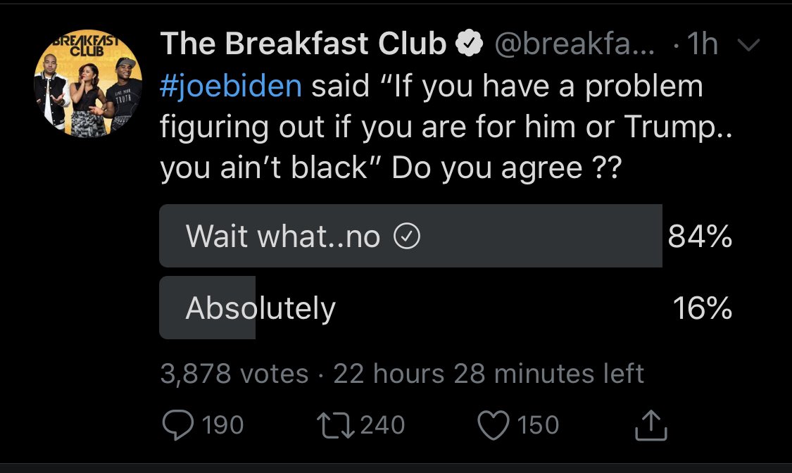 @JoeBiden’s “plantation thinking” that#YouAintBlack if you support@realDonaldTrump Let your voice be heard here: https://twitter.com/breakfastclubam/status/1263800545321586688?s=21 …pic.twitter.com/gJsnniwSoY