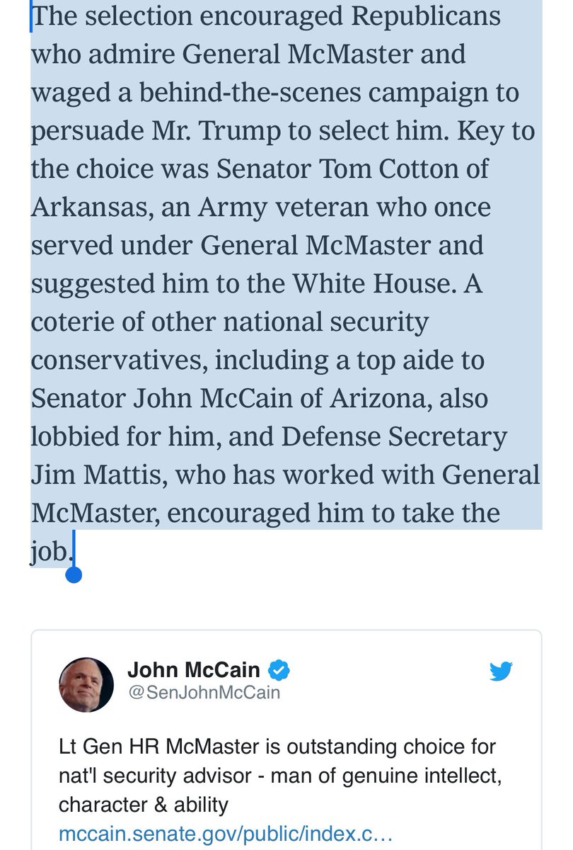 @SenTomCotton was one of the people pushing for McMaster. Not a good look then or now. https://www.nytimes.com/2017/02/20/us/politics/mcmaster-national-security-adviser-trump.html …pic.twitter.com/2mJi06mmGp