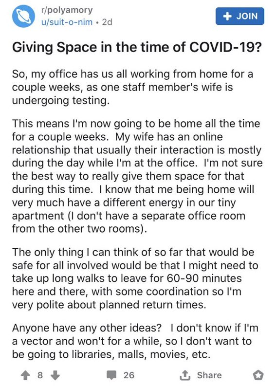 So he works all day so his wife can have an emotional affair during the day while he is at work. Wow.