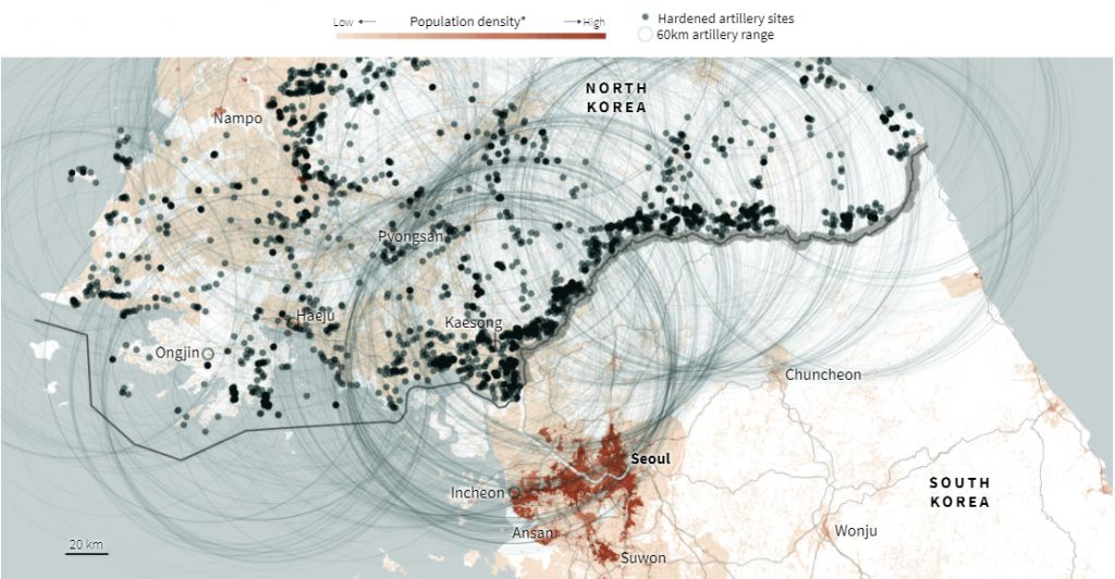 Something like 20,000 artillery pieces within range of Seoul. Could easily drop 100,000 shells in just a minute or two. Literally enough to level half the city in 10 minutes.