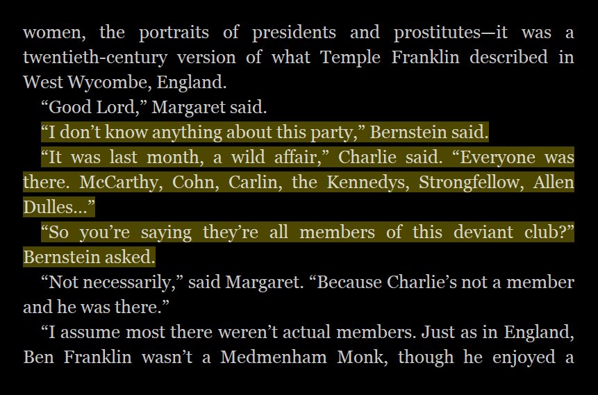 Just got to the part in @JakeTapper’s novel Hellfire Club where he reveals a secret sex cult run by DC elites to control policy through blackmail and murder