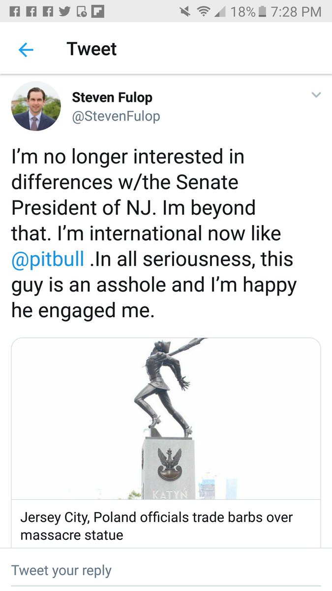 Steven Fulop is a democrat and Trump hater. He tweets quite a lot. He gloats that his city is the most diverse and then wonders why there are so many illegal guns on the streets. Not too bright this one. He takes credit for other people's work but seems to work for the people.