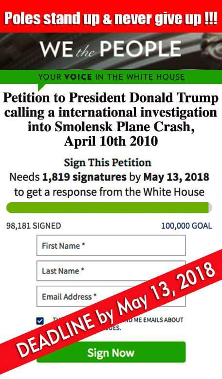 Help us! Sign our petition: https://petitions.whitehouse.gov/petition/petition-donald-trump-calling-international-investigation-smolensk-plane-crash-april-10th-2010 … four hours left and 2 thousand voices to gain! pic.twitter.com/66YfcDcFNi
