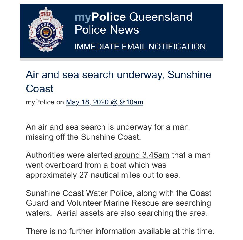 #BREAKING A SEPARATE search is underway on the#SunshineCoast for a missing man believed to have fallen off a yacht. This follows the search, which is continuing, this morning for a man who fell off a fishing trawler.@WINNews_SCoastpic.twitter.com/VvZ1dTOltz