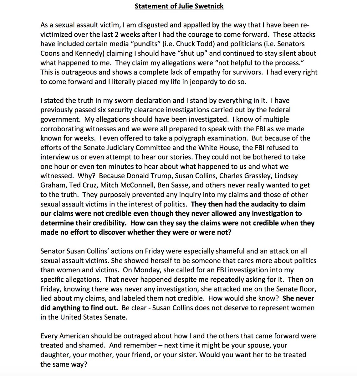 Below please find a statement from my client Julie Swetnick regarding the Kavanaugh nomination. I urge you to read it.pic.twitter.com/kBHL7cm8Pi