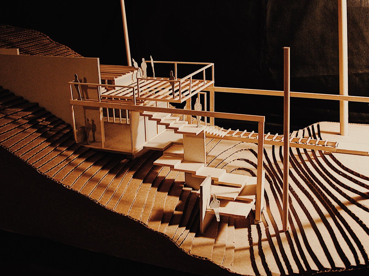 This concept model for an art gallery on UC Berkeley’s campus doubles as a bridge spanning Strawberry Creek. The design engages with the topography of the site allowing visitors to either cross or easily access the creek.
