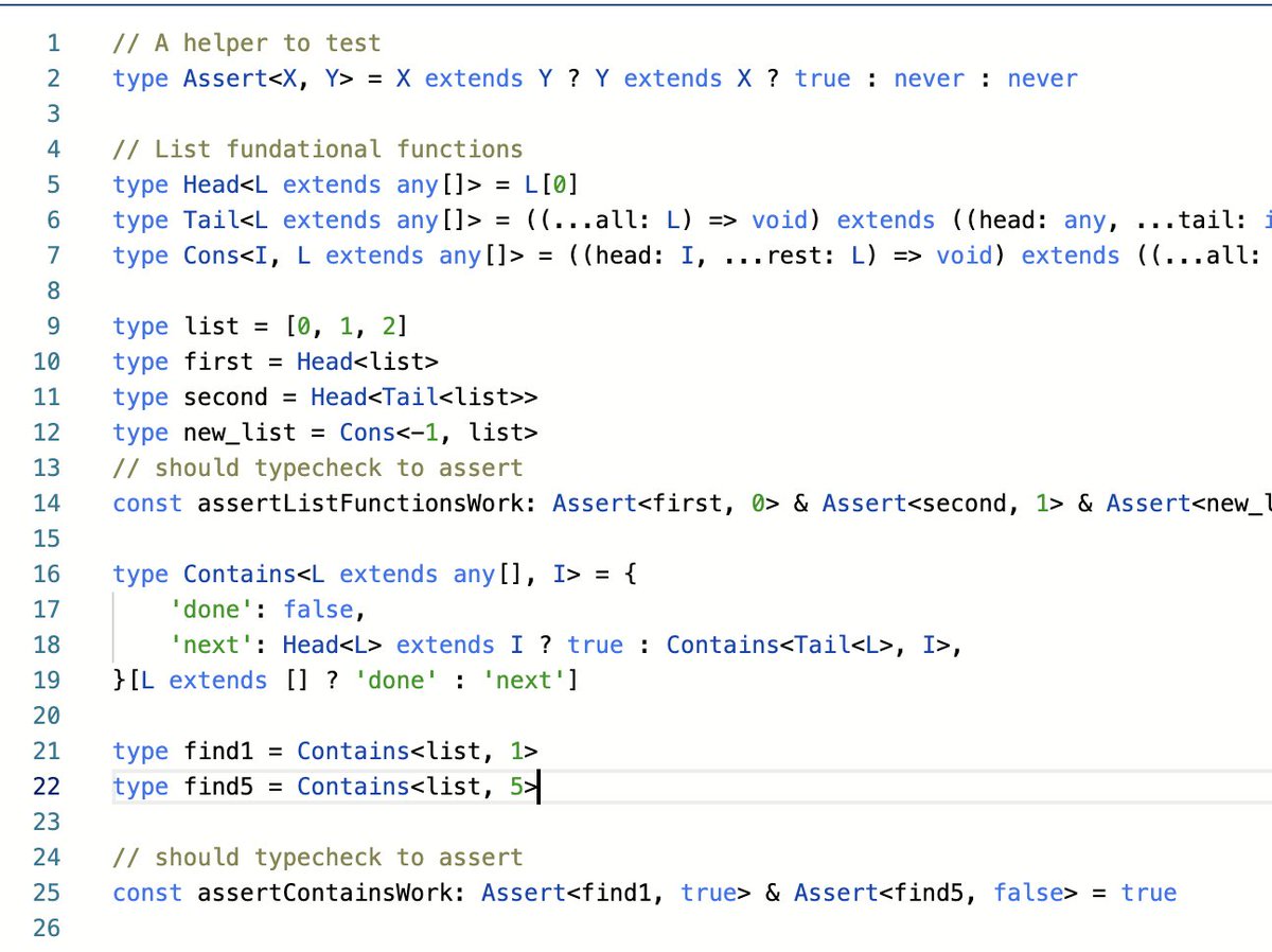 Worked out a way to abuse TypeScript's type-checker to perform arbitrary computations on lists of values. All in the type-system! https://www.typescriptlang.org/play/index.html?ssl=22&ssc=1&pln=23&pc=1#code/PTAEEFQCwUwGwA4wE6gC4Ht0wM5oFBoCeSEOOKaAPABoA0oAmgHygC8oNoMAHmjADsAJjiagA-GN79horpLTIArjFAAuUAJgA3FOs06U+fCFAAZAJZ5QAMyXCAhmgsYBDuLfsBjZ65yESVQAJGAchKjNuPkERUAcBIgBtAF1WDjNEgAZkgNIAFQcLOAiomVj4pNT2UAAKGoA6Rvc4DTMASnZWbQwLIQ7pGNE62DCNCoZG+rRCltALARs9AqKOti6evolQZY8NLV1kXNUAYT8qAEkGSIHZOISUtNqakaENS9BJ5Fw0VtX13v60VudUmzQ080WqAAcu1OqBugCtjD9PsjEdQHArGhqlkGABGBgAJhyxFINgsyGsHBCYSomLwzHRFC8riE1Rp4R2dKxzEZpNUWgA7gB9enYjinAQ4KgAWgJGJ5JjAOCgGCUcDZ-K8sC8AGt0FgHORKPgWVLsUaKMg0JY8AAxby+KUAdQwyF1GnAxutVHJlLQDEyrAAZGQrdRmaz8SGw5QqELRViGIk5YH8USqhxFCpjPzQJLpvNpdcgeV7skGOdHgBvfCgeugADkQlcMEbGhs7godDrDcbWj47dAHIirBusXOW2zqg0BcKUqoXLMzErK-wAF9EiWyqIUltm63G-p+9JGzl0eThHjqnOi9y8NGL-MhABWG+uQsLsUMF+MpWgFU1Q1dBAm1GA9QNOJvQIM1rEtShbxdN0PVjH1LyEeVpxjL1w19Z8XwYTs4AoR5p3wIA …pic.twitter.com/rAFxjrQ66L