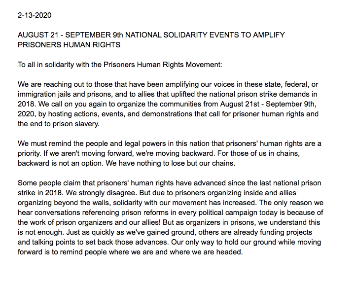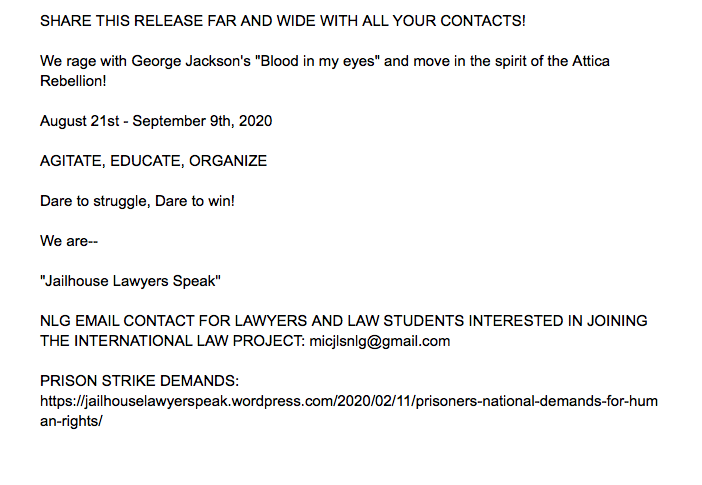 NEW FROM @JailLawSpeak: A CALL FOR AUGUST 21 - SEPTEMBER 9th NATIONAL SOLIDARITY EVENTS TO AMPLIFY PRISONERS HUMAN RIGHTS + INFO ON THEIR INTERNATIONAL LAW PROJECTpic.twitter.com/wz68JekJfj