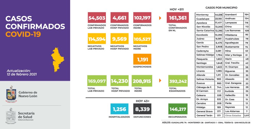 Les comparto las cifras de casos COVID-19 en Nuevo León al 12 de febrero. Es muy importante seguir las medidas de higiene y prevención que la Secretaría de Salud nos indica. ¡Cuídate y cuida a los demás!