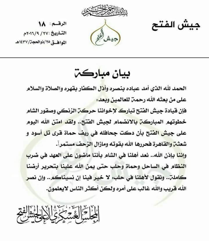 announcement by #JAF (ex Nusra) that Nour el-Din Zinki & Suqour al-Sham have joined them #Syriapic.twitter.com/w1nYOUS9pl