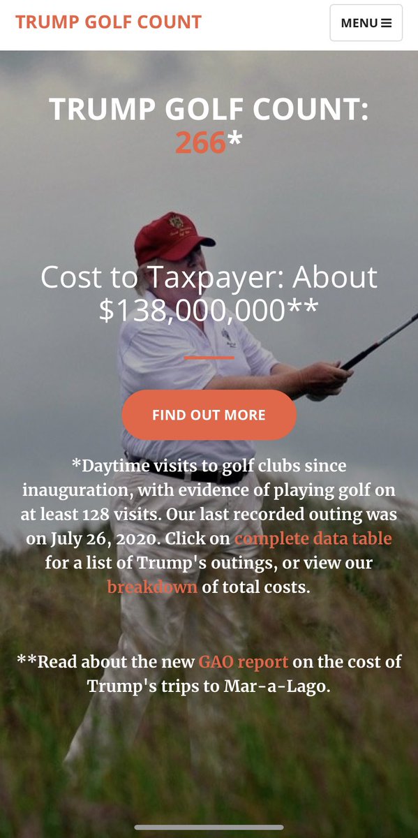 As of July 26th: Approximately 345 presidential salaries. $138,000,000 tax dollars spent so that in the midst of the worst financial and health crisis in a generation, the person who’s supposed to be at the helm... can golf. 4.5 million infections 153,855 deaths He golfs.pic.twitter.com/jgeVacW52p