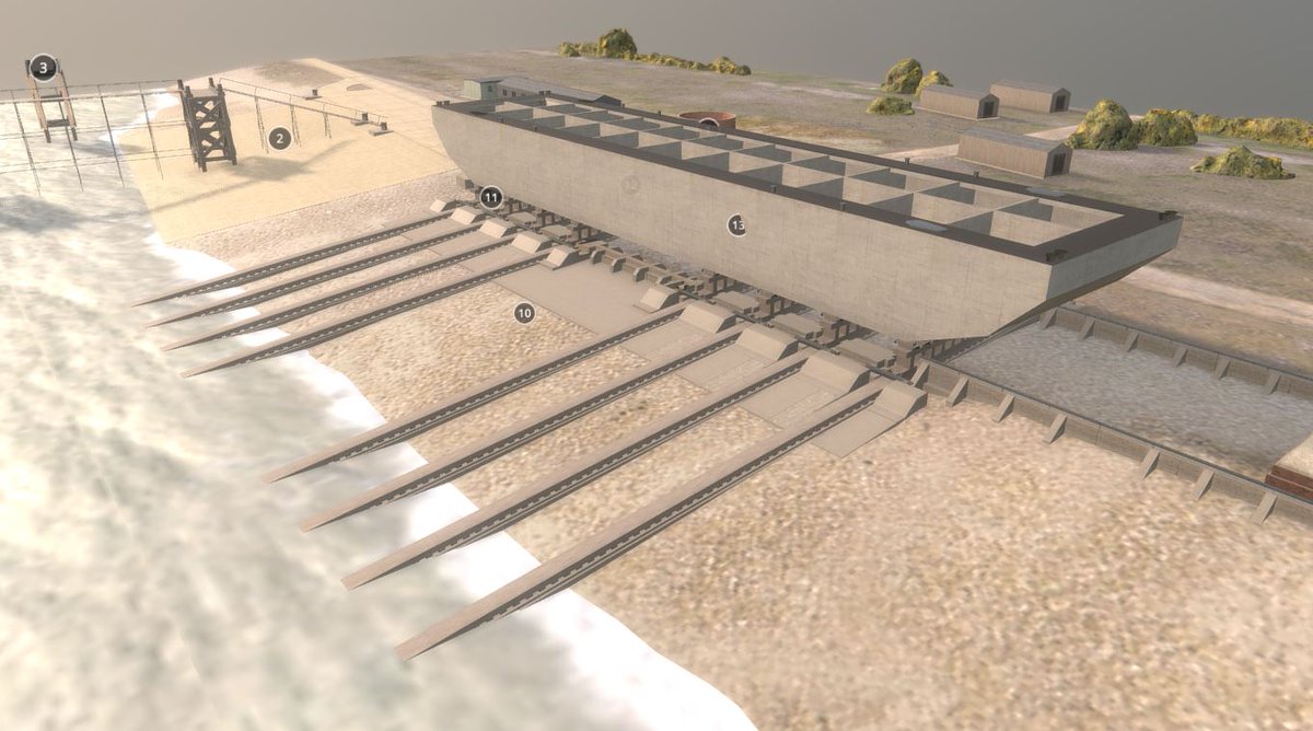 Lepe, New Forest as it might have appeared in spring 1944, showing Q2 embarkation hard and the construction site for 6 Mulberry Phoenix B2 caissons. I supplied the historical background and plans and the model was created by