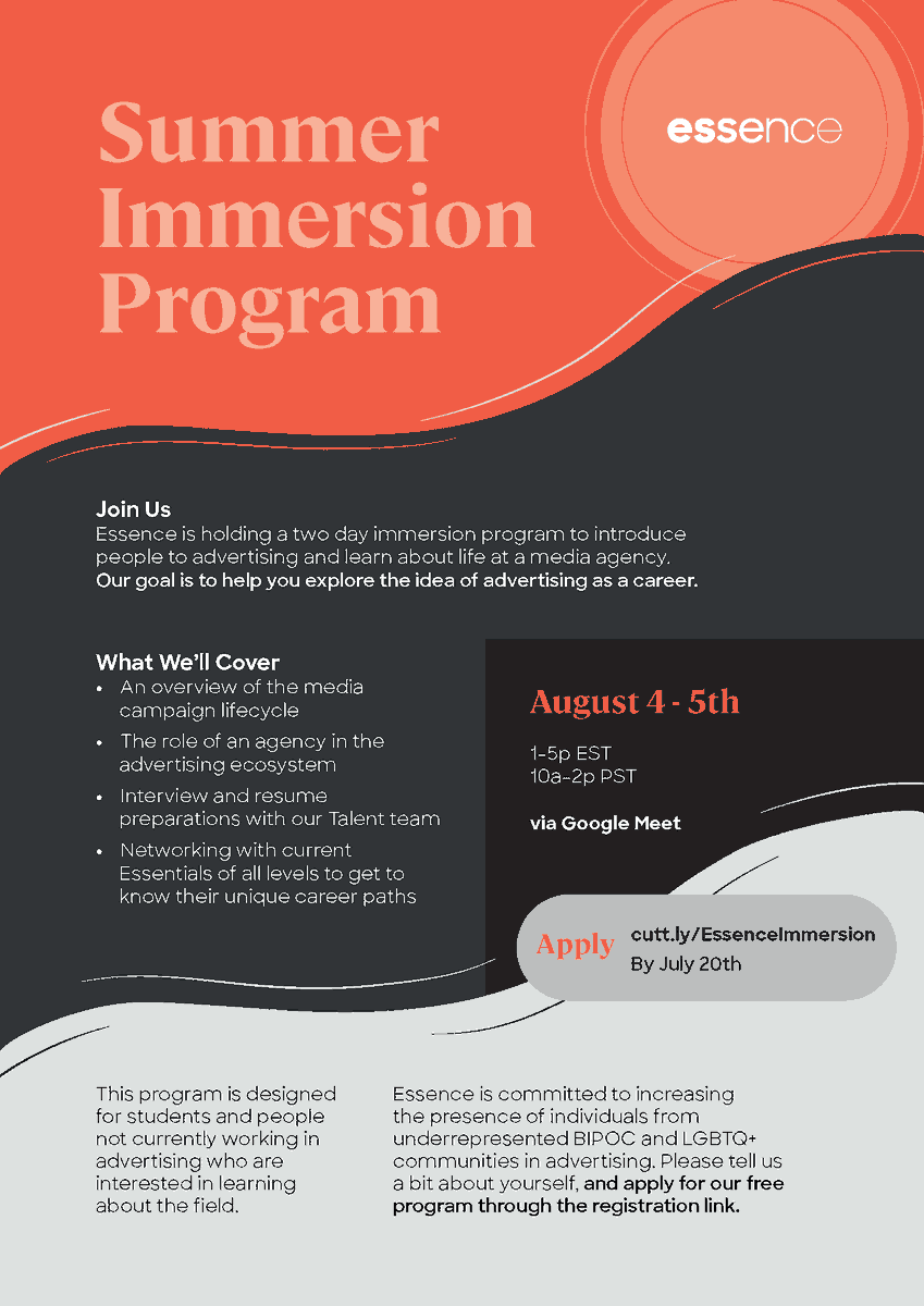 Know someone who's exploring their career options? We're running a two day immersion program this August to familiarize people with the wide range of opportunities that exist in media and marketing. Sign up here: http://cutt.ly/EssenceImmersion …pic.twitter.com/N3bwkyxo2E