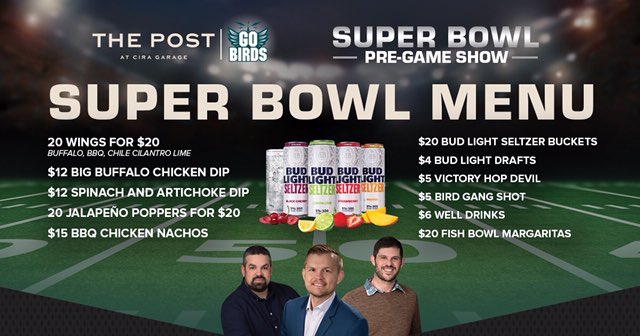 Super Bowl preview show and watch party with the @GoBirdsPod crew tomorrow at “The Post” in University City and enjoy the release of@budlight Seltzer.#SuperBowlLIV#FlyEaglesFly