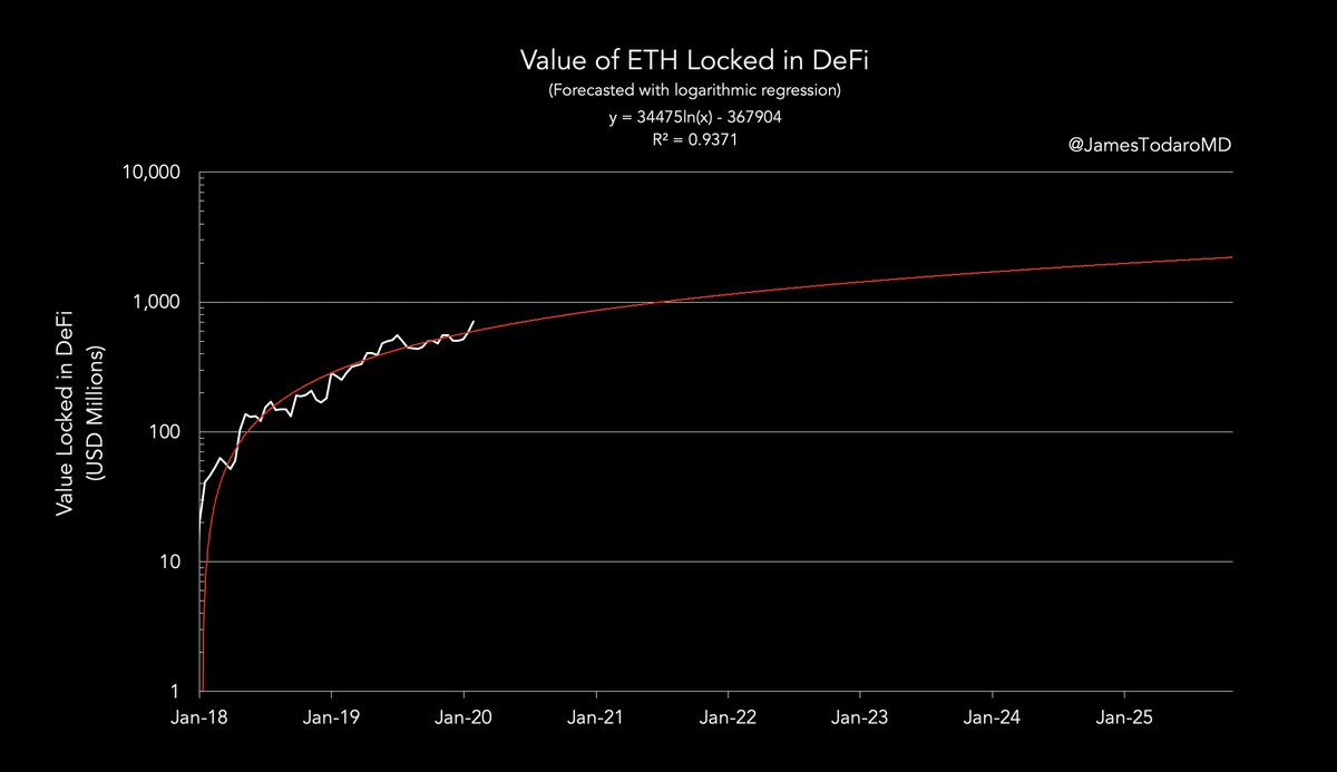Chart of a 5-year projection of the USD value locked in DeFi. With an R-squared of 94%, log regression projects there will be only ~$2B of ETH locked up by the year 2025. Ethereum market cap today is about $20B. Any thoughts from the